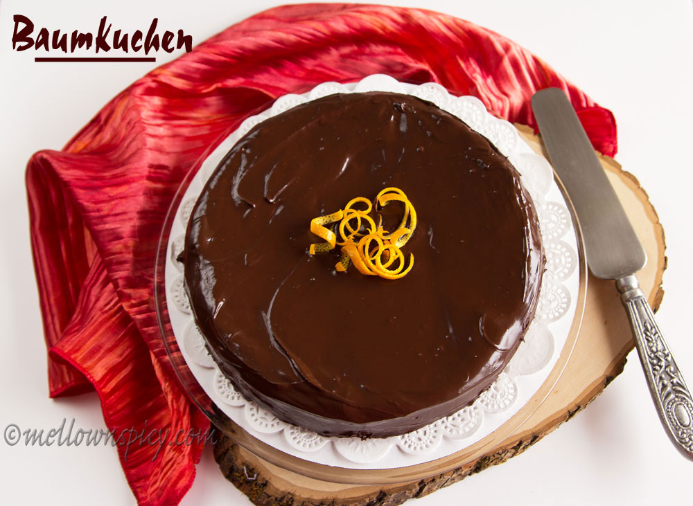 Baumkuchen which in German means a ‘tree cake’. Traditionally, Baumkuchen is made on a spit by brushing on even layers of batter and then rotating the spit around a heat source. Each layer is allowed to brown before a new layer of batter is poured.When the cake is removed and sliced, each layer is divided from the next by a golden line, resembling the growth rings on a crosscut tree.