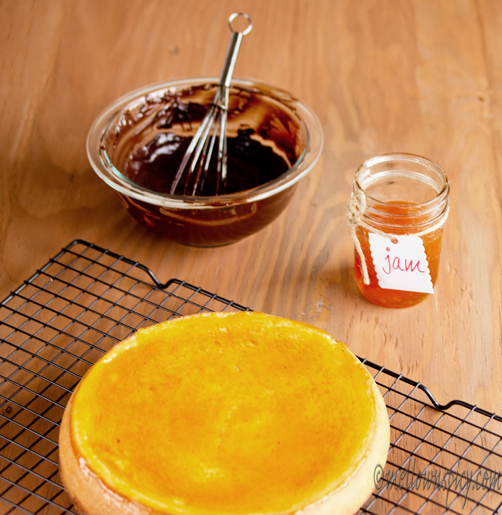 - Heat the jam a little, pass it through a sieve, and add the orange liqueur (optional). Cover the cake with the jam and let it cool.