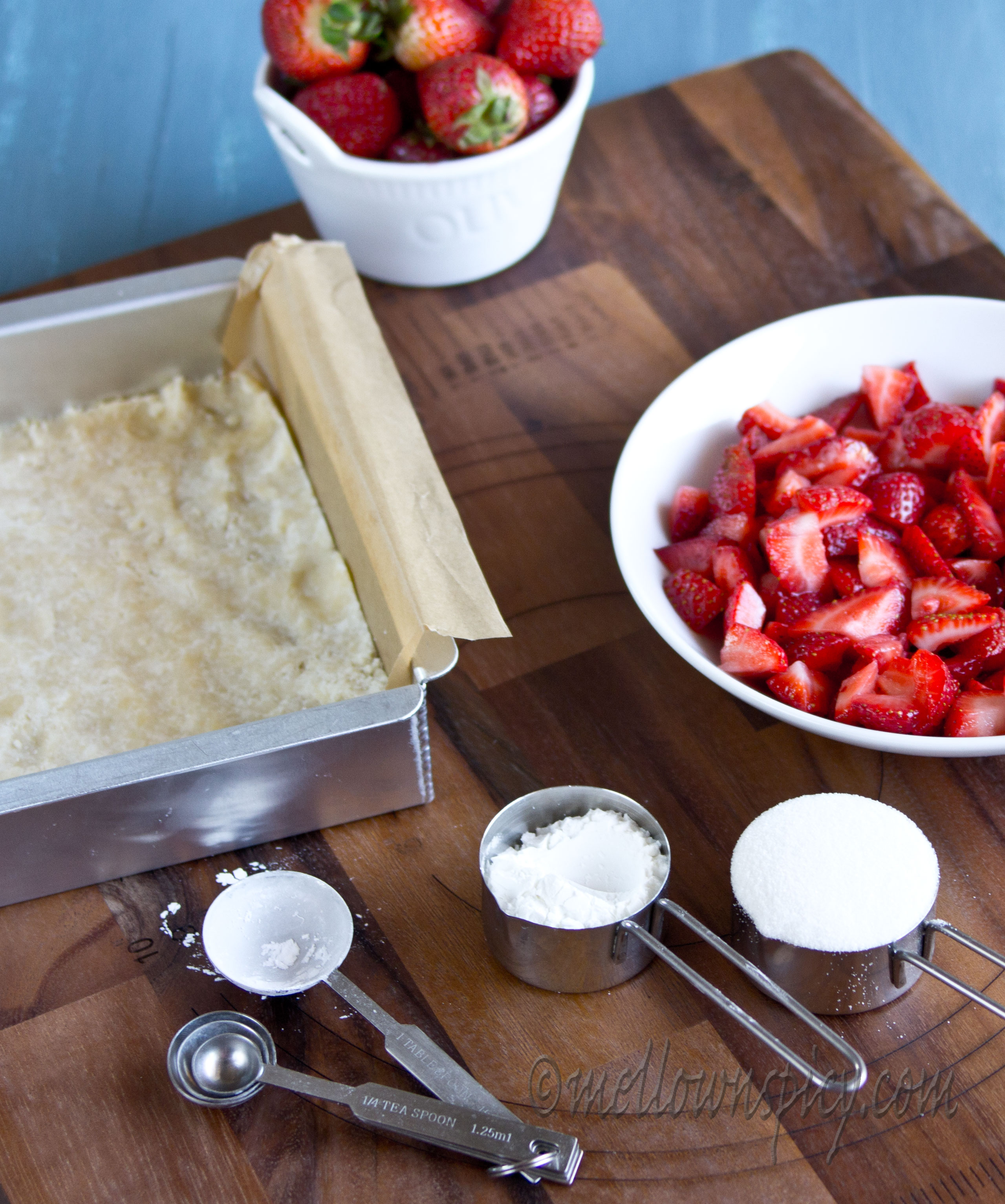 - In a separate bowl add the chopped strawberries, remaining 1/4 cup sugar and cornstarch and combine to coat the strawberries evenly.