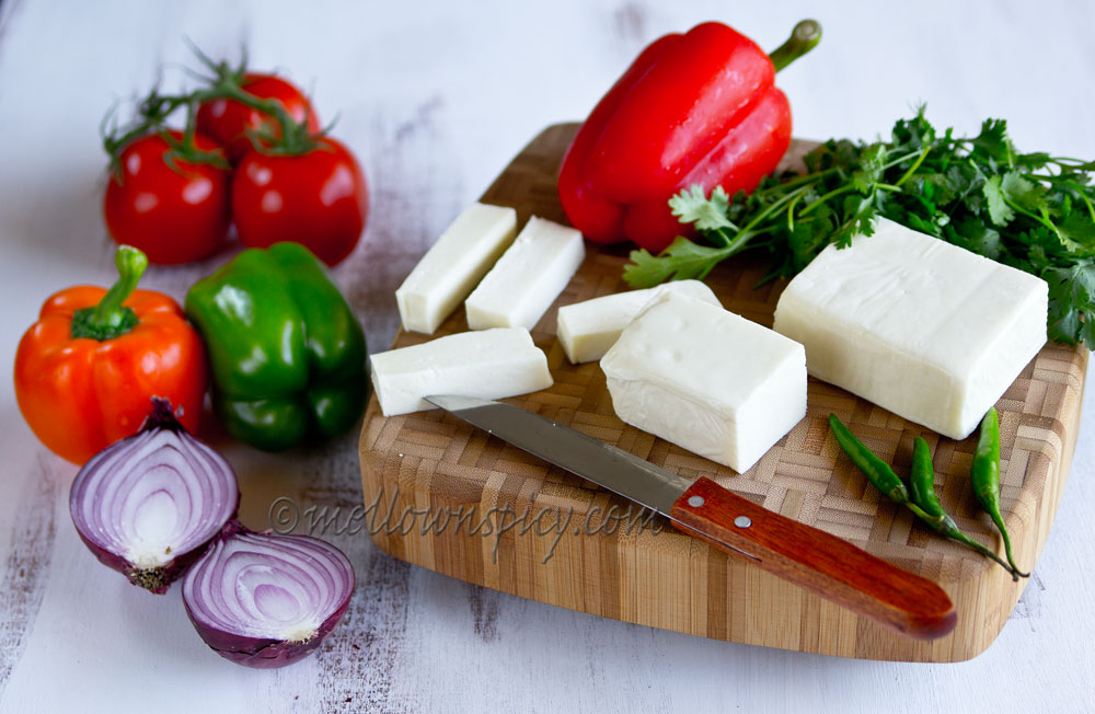 - Cut the paneer,bell peppers, onion and tomato in long thin strips. Cut the ginger in juliennes.