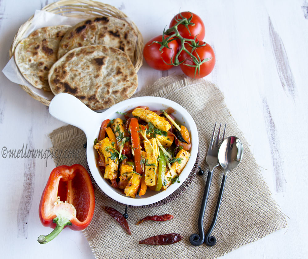 Paneer Jhalfrezi is a colorful dish and tastes tangy, spicy and hot. It gets the tanginess from the tomato ketchup and vinegar. Sugar in the recipe is optional but it balances the tanginess. This goes great with homemade chapatti, paratha or any other Indian breads.