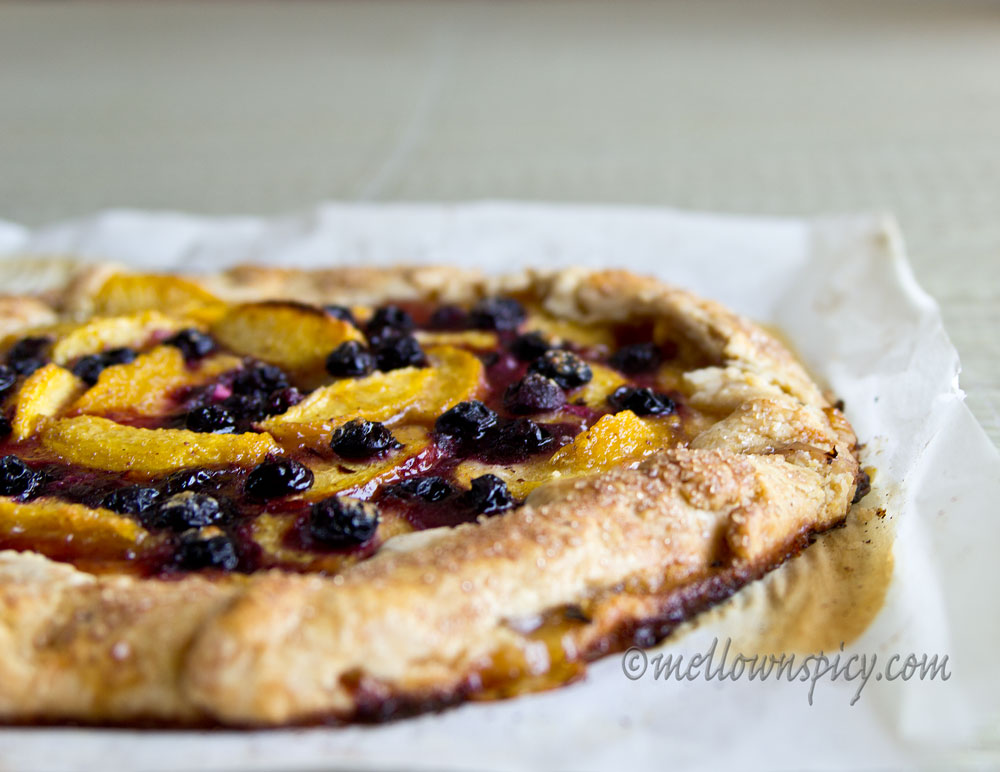 - Pre-heat the oven to 375F . Bring the rolled out dough and place the peaches and blueberries in the center. Arrange the way you like leaving a border of 2 inches around the outside of the edges.