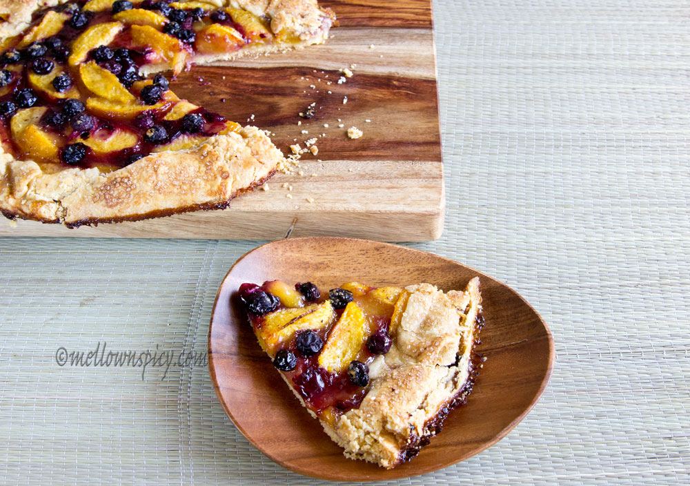 Galette is a freeform round, flat crusty cake with a flaky pastry dough. It can be sweet or savory. The texture resembles that of a pie but it is way easier than baking a pie.The shaping of the dough need not be fancy as it usually has a rustic look to it.