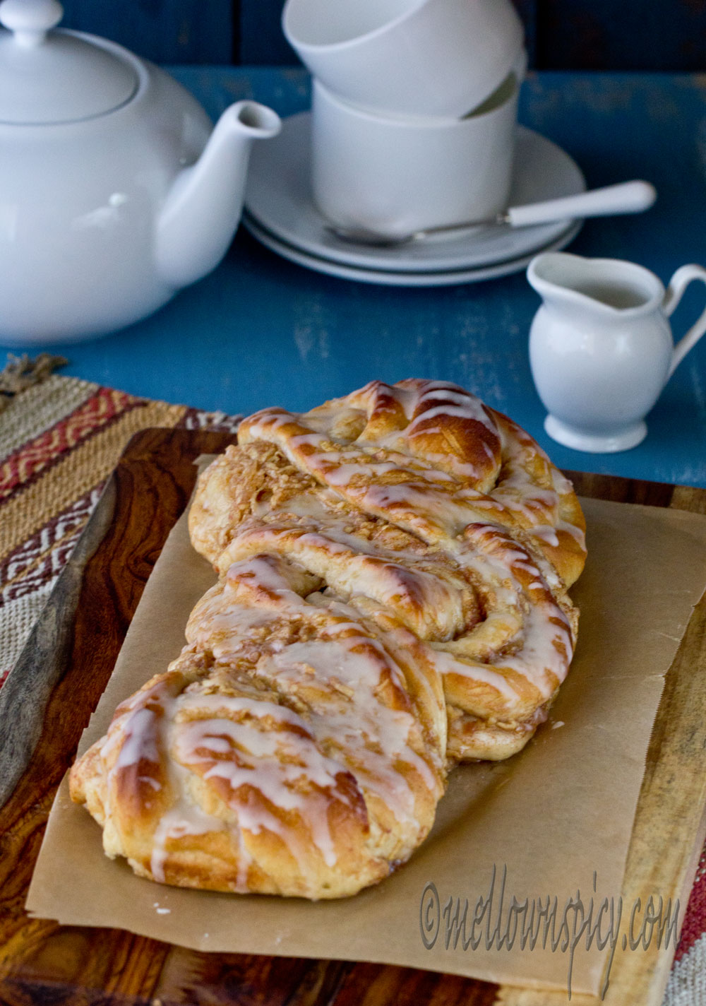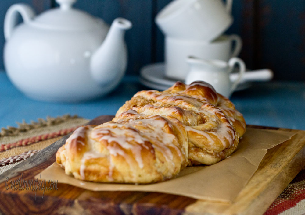 The soft bread with a sweet filling is a perfect hit with a cup of morning coffee. The shape of the bread is very interesting with twists and swirls. The glaze makes the bread extra special and can be had as a dessert.