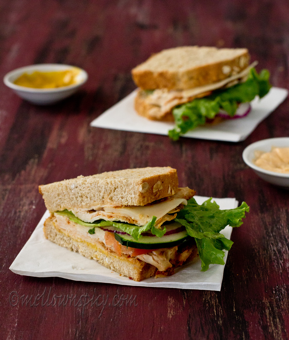 This chicken and cheese sandwich is so easy to prepare that you need no recipe. Use whatever vegetables you prefer and add in to the sandwich. These are the vegetables I like to use and often have in hand. You may add any spread of your choice but the chipotle mayo gives a spicy kick to the recipe and I love it. The sweet taste of the honey mustard compliments the spiciness of the chipotle chicken and brings a perfect flavor to the sandwich.