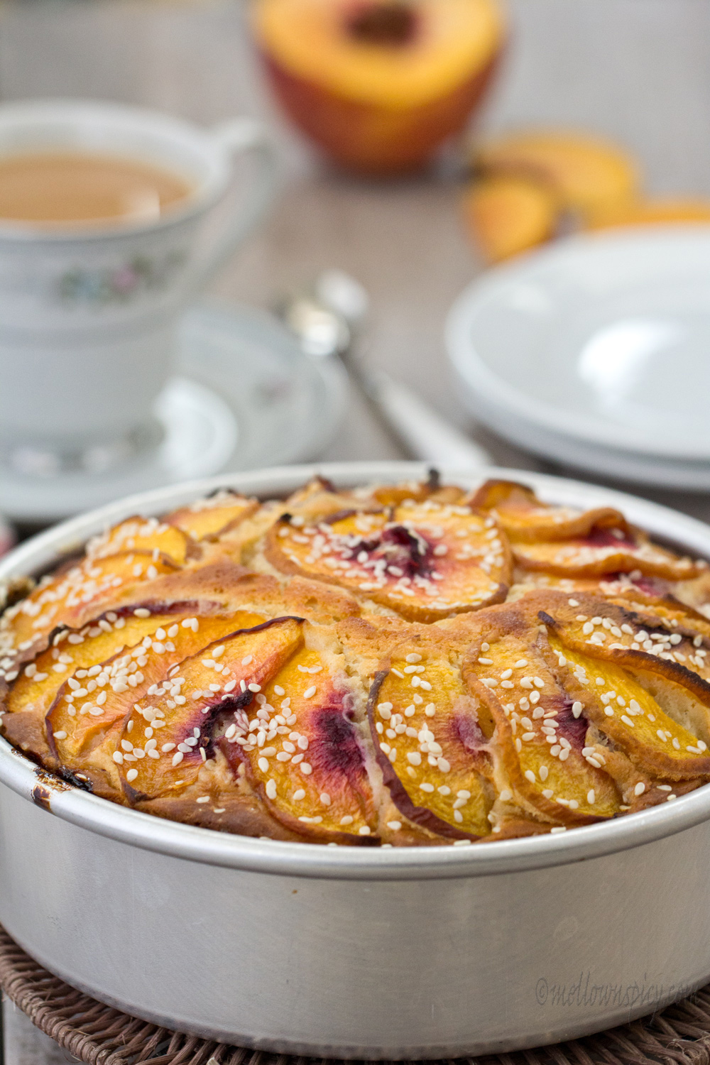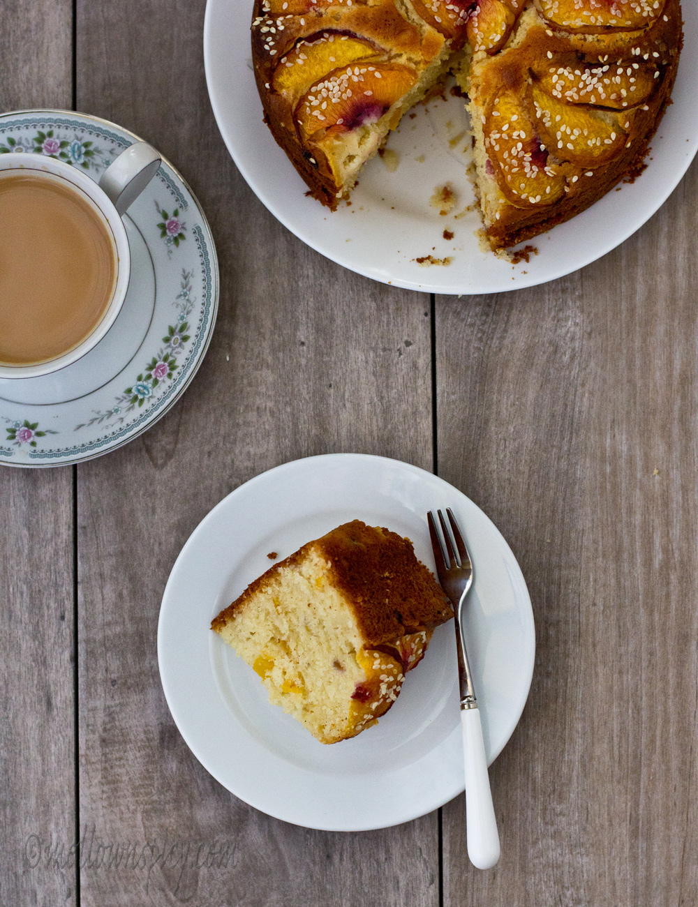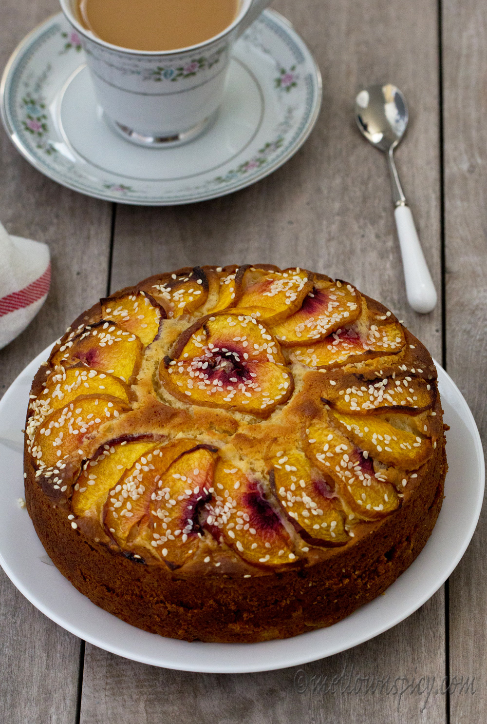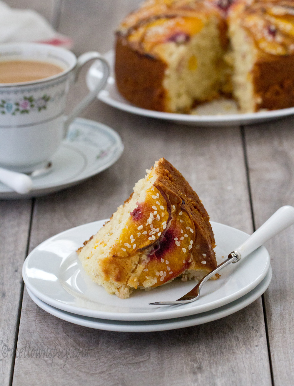 The cake looks so pretty and tastes equally good with sweet peaches in every bite. The yogurt in the recipe makes the cake very moist without overpowering the taste. The hint of nutmeg gives a warm, sweet flavor and the sesame topping adds a crunch to the cake.